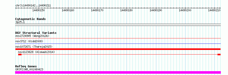 Variant DetailsVariant: nsv1072671| Internal ID | 19323446 | | Landmark | | | Location Information | | | Cytoband | 3p25.1 | | Allele length | | Assembly | Allele length | | hg38 | 70 | | hg19 | 70 |