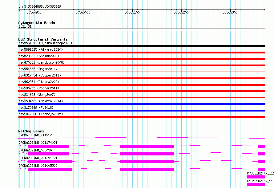 Variant DetailsVariant: nsv1072688| Internal ID | 19319103 | | Landmark | | | Location Information | | | Cytoband | 3p21.31 | | Allele length | | Assembly | Allele length | | hg38 | 502 | | hg19 | 502 |