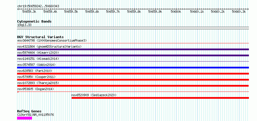 Variant DetailsVariant: nsv1072893| Internal ID | 19318296 | | Landmark | | | Location Information | | | Cytoband | 19q13.33 | | Allele length | | Assembly | Allele length | | hg38 | 1102 | | hg19 | 1102 |
