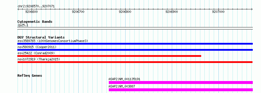 | Variant Type | CNV deletion | Copy Number | | Allele State | | Allele Origin | | Probe Count | | Validation Flag | | Merged Status | M | Merged Variants | | Supporting Variants | nssv3764202 | Samples | KWP1 | Known Genes | ASAP2 | Method | Sequencing | Analysis | HugeSeq | Platform | Illumina HiSeq 2000 | Comments | | Reference | Thareja_et_al_2015 | Pubmed ID | 25765185 | Accession Number(s) | nsv1072919