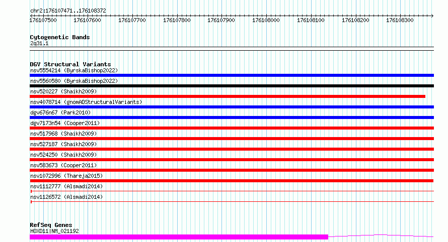| | Variant Type | CNV deletion | | Copy Number | | | Allele State | | | Allele Origin | | | Probe Count | | | Validation Flag | | | Merged Status | M | | Merged Variants | | | Supporting Variants | nssv3762737 | | Samples | KWP1 | | Known Genes | HOXD11 | | Method | Sequencing | | Analysis | HugeSeq | | Platform | Illumina HiSeq 2000 | | Comments | | | Reference | Thareja_et_al_2015 | | Pubmed ID | 25765185 | | Accession Number(s) | nsv1072996