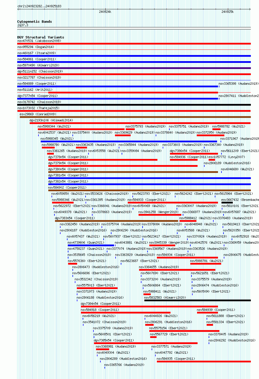 Variant DetailsVariant: nsv1073032| Internal ID | 19326655 | | Landmark | | | Location Information | | | Cytoband | 2q37.3 | | Allele length | | Assembly | Allele length | | hg38 | 1902 | | hg19 | 1902 |