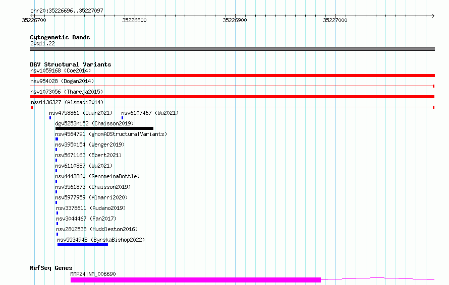 Variant DetailsVariant: nsv1073056| Internal ID | 19323961 | | Landmark | | | Location Information | | | Cytoband | 20q11.22 | | Allele length | | Assembly | Allele length | | hg38 | 402 | | hg19 | 402 |