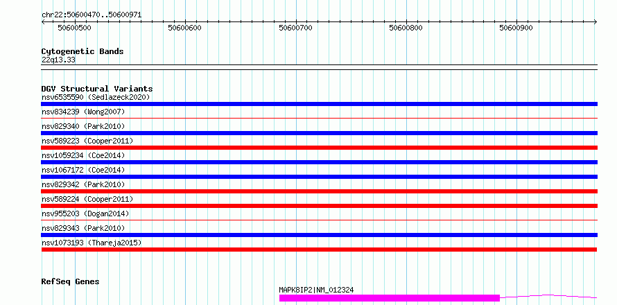 Variant DetailsVariant: nsv1073193| Internal ID | 19315941 | | Landmark | | | Location Information | | | Cytoband | 22q13.33 | | Allele length | | Assembly | Allele length | | hg38 | 502 | | hg19 | 502 |