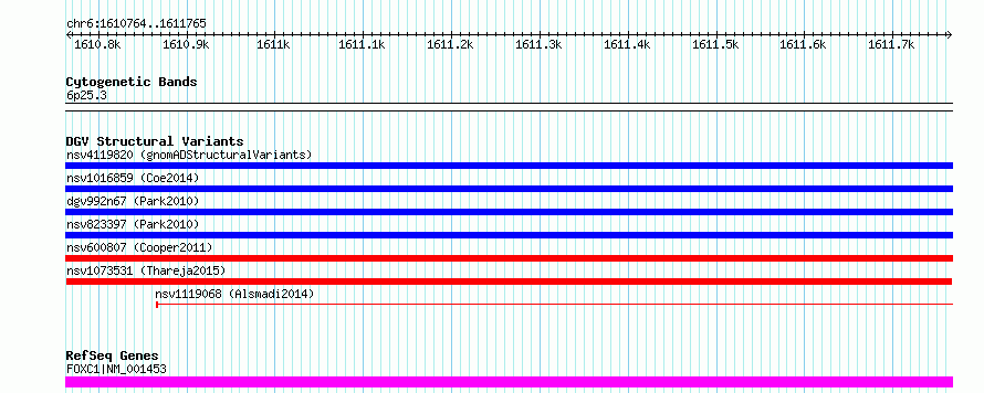 Variant DetailsVariant: nsv1073531| Internal ID | 18977040 | | Landmark | | | Location Information | | | Cytoband | 6p25.3 | | Allele length | | Assembly | Allele length | | hg38 | 1002 | | hg19 | 1002 |