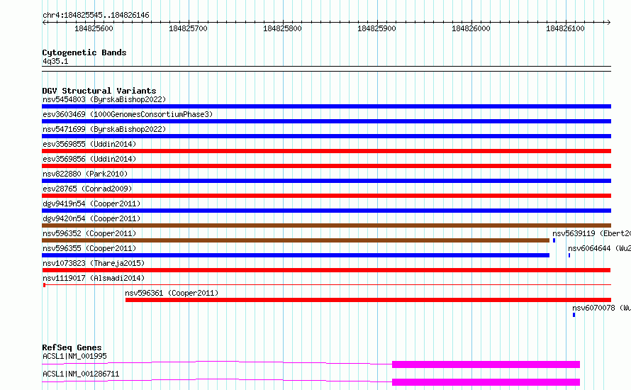 Variant DetailsVariant: nsv1073823| Internal ID | 19321284 | | Landmark | | | Location Information | | | Cytoband | 4q35.1 | | Allele length | | Assembly | Allele length | | hg38 | 602 | | hg19 | 602 |