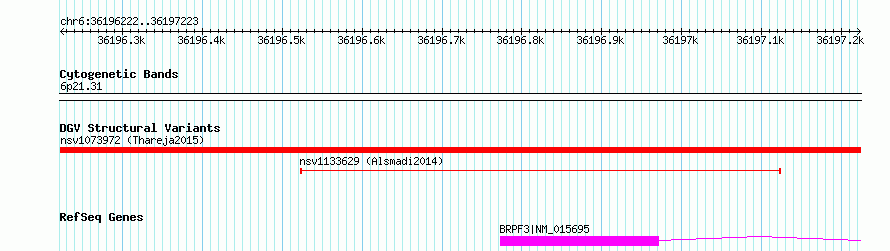 | Variant Type | CNV deletion | Copy Number | | Allele State | | Allele Origin | | Probe Count | | Validation Flag | | Merged Status | M | Merged Variants | | Supporting Variants | nssv3771898 | Samples | KWP1 | Known Genes | BRPF3 | Method | Sequencing | Analysis | HugeSeq | Platform | Illumina HiSeq 2000 | Comments | | Reference | Thareja_et_al_2015 | Pubmed ID | 25765185 | Accession Number(s) | nsv1073972