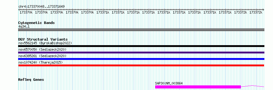 Variant DetailsVariant: nsv1074240| Internal ID | 19322699 | | Landmark | | | Location Information | | | Cytoband | 4q34.1 | | Allele length | | Assembly | Allele length | | hg38 | 1602 | | hg19 | 1602 |