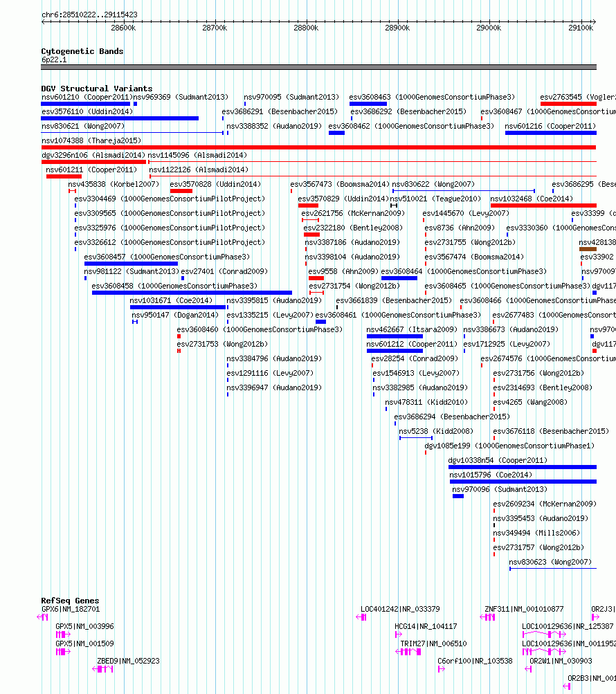 Variant DetailsVariant: nsv1074388| Internal ID | 18977940 | | Landmark | | | Location Information | | | Cytoband | 6p22.1 | | Allele length | | Assembly | Allele length | | hg38 | 605202 | | hg19 | 605202 |
