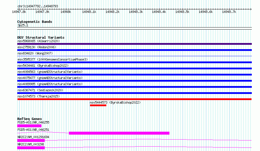 Variant DetailsVariant: nsv1074573| Internal ID | 19321385 | | Landmark | | | Location Information | | | Cytoband | 3p25.1 | | Allele length | | Assembly | Allele length | | hg38 | 1002 | | hg19 | 1002 |