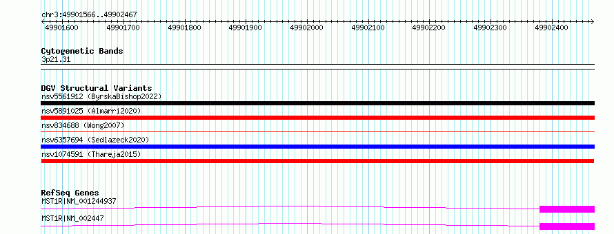 Variant DetailsVariant: nsv1074591| Internal ID | 19319779 | | Landmark | | | Location Information | | | Cytoband | 3p21.31 | | Allele length | | Assembly | Allele length | | hg38 | 902 | | hg19 | 902 |