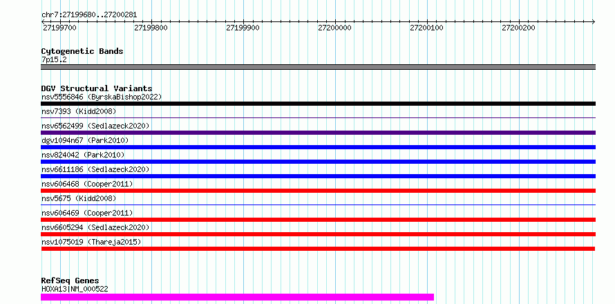 | | Variant Type | CNV deletion | | Copy Number | | | Allele State | | | Allele Origin | | | Probe Count | | | Validation Flag | | | Merged Status | M | | Merged Variants | | | Supporting Variants | nssv3762674 | | Samples | KWP1 | | Known Genes | HOXA13 | | Method | Sequencing | | Analysis | HugeSeq | | Platform | Illumina HiSeq 2000 | | Comments | | | Reference | Thareja_et_al_2015 | | Pubmed ID | 25765185 | | Accession Number(s) | nsv1075019