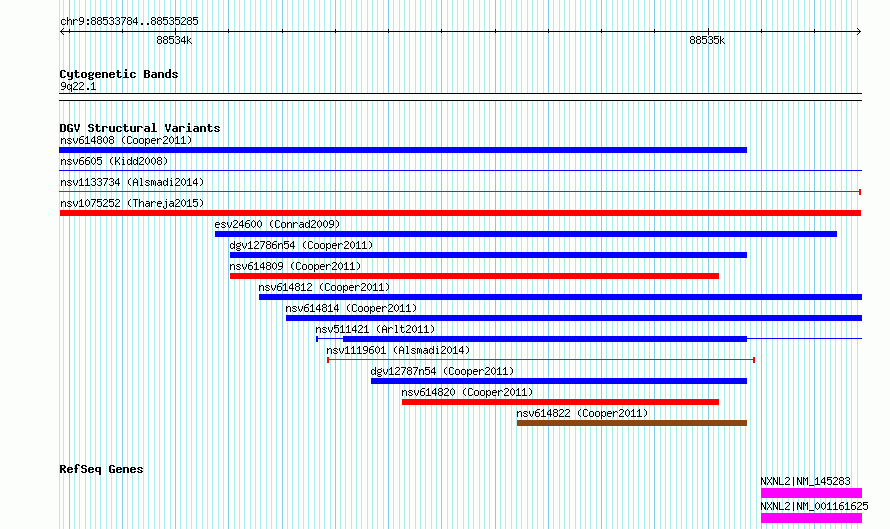 Variant DetailsVariant: nsv1075252| Internal ID | 19324852 | | Landmark | | | Location Information | | | Cytoband | 9q22.1 | | Allele length | | Assembly | Allele length | | hg38 | 1502 | | hg19 | 1502 |