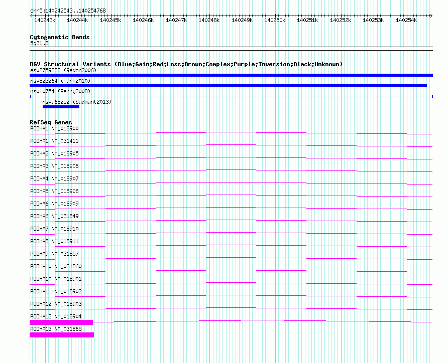 | | Variant Type | CNV gain | | Copy Number | | | Allele State | | | Allele Origin | | | Probe Count | | | Validation Flag | | | Merged Status | M | | Merged Variants | | | Supporting Variants | nssv16223 | | Samples | NA18972 | | Known Genes | PCDHA1, PCDHA10, PCDHA11, PCDHA12, PCDHA13, PCDHA2, PCDHA3, PCDHA4, PCDHA5, PCDHA6, PCDHA7, PCDHA8, PCDHA9 | | Method | Oligo aCGH | | Analysis | Statistical threshold = 5.0, minimum +/- log2 ratio = 0.25 and minimum number of probes = 2 | | Platform | Agilent-015686 Custom Human 244K CGH Microarray | | Comments | | | Reference | Perry_et_al_2008 | | Pubmed ID | 18304495 | | Accession Number(s) | nsv10754