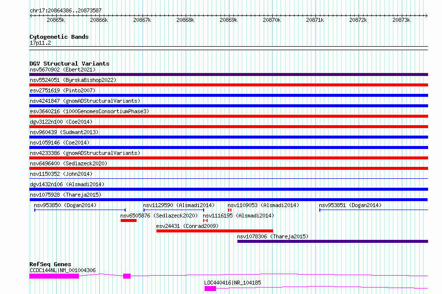 Variant DetailsVariant: nsv1075928| Internal ID | 19322987 | | Landmark | | | Location Information | | | Cytoband | 17p11.2 | | Allele length | | Assembly | Allele length | | hg38 | 9202 | | hg19 | 9202 |