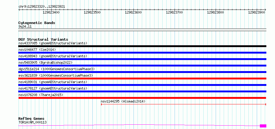 Variant DetailsVariant: nsv1076208| Internal ID | 19323119 | | Landmark | | | Location Information | | | Cytoband | 9q34.11 | | Allele length | | Assembly | Allele length | | hg38 | 602 | | hg19 | 602 |