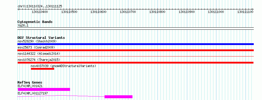 | | Variant Type | CNV deletion | | Copy Number | | | Allele State | | | Allele Origin | | | Probe Count | | | Validation Flag | | | Merged Status | M | | Merged Variants | | | Supporting Variants | nssv3766816 | | Samples | KWP1 | | Known Genes | ELF4 | | Method | Sequencing | | Analysis | HugeSeq | | Platform | Illumina HiSeq 2000 | | Comments | | | Reference | Thareja_et_al_2015 | | Pubmed ID | 25765185 | | Accession Number(s) | nsv1076274
