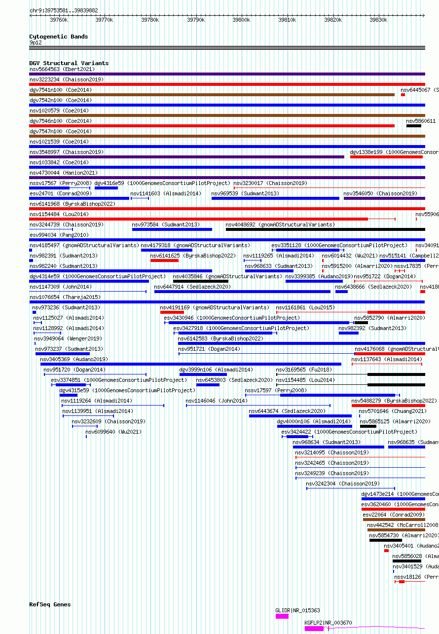 Variant DetailsVariant: nsv1076654| Internal ID | 19319853 | | Landmark | | | Location Information | | | Cytoband | 9p12 | | Allele length | | Assembly | Allele length | | hg38 | 86302 | | hg19 | 86302 |