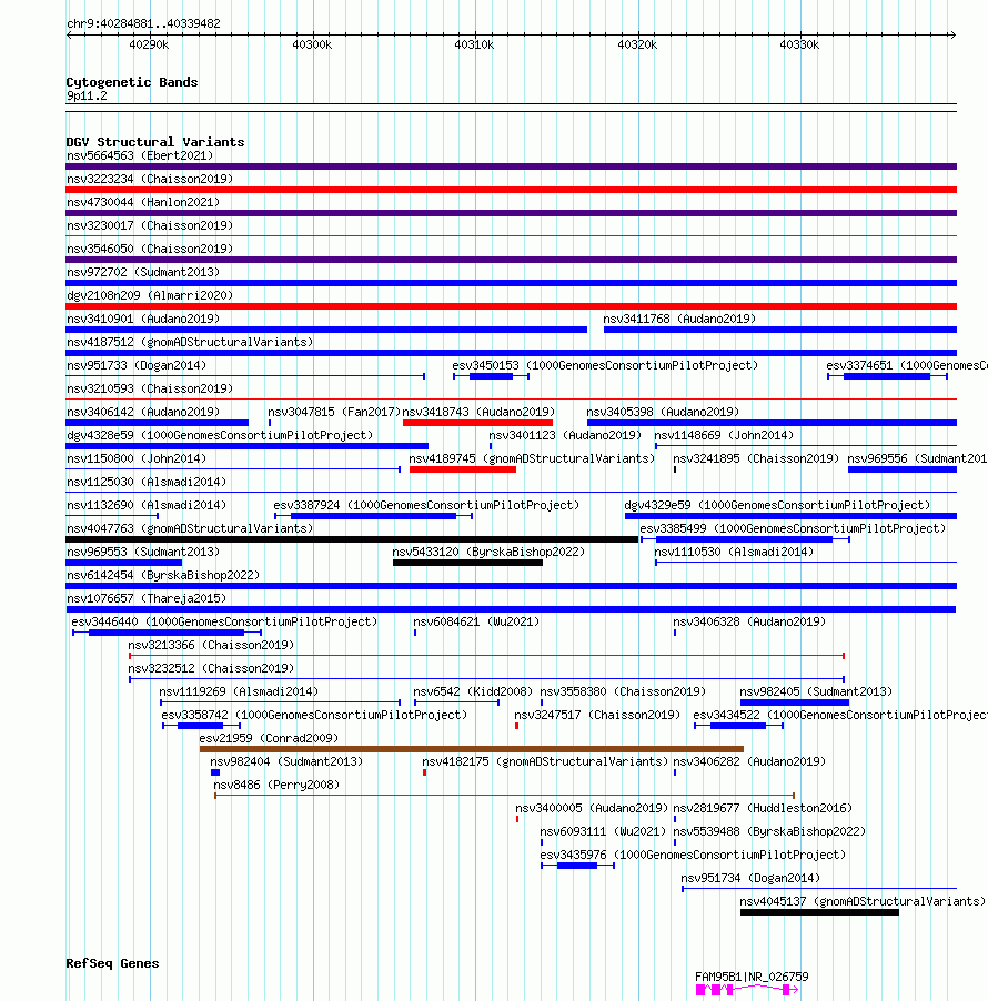 Variant DetailsVariant: nsv1076657| Internal ID | 19319869 | | Landmark | | | Location Information | | | Cytoband | 9p12 | | Allele length | | Assembly | Allele length | | hg38 | 54602 | | hg19 | 54602 |