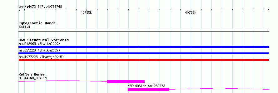 | | Variant Type | CNV deletion | | Copy Number | | | Allele State | | | Allele Origin | | | Probe Count | | | Validation Flag | | | Merged Status | M | | Merged Variants | | | Supporting Variants | nssv3762073 | | Samples | KWP1 | | Known Genes | MED14 | | Method | Sequencing | | Analysis | HugeSeq | | Platform | Illumina HiSeq 2000 | | Comments | | | Reference | Thareja_et_al_2015 | | Pubmed ID | 25765185 | | Accession Number(s) | nsv1077225