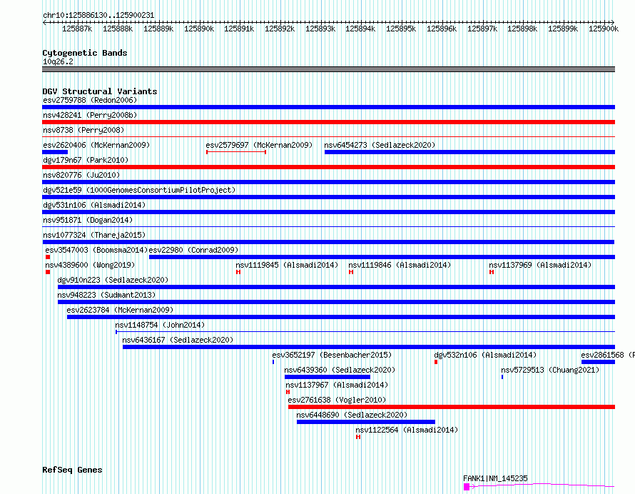 Variant DetailsVariant: nsv1077324| Internal ID | 19320306 | | Landmark | | | Location Information | | | Cytoband | 10q26.2 | | Allele length | | Assembly | Allele length | | hg38 | 14102 | | hg19 | 14102 |