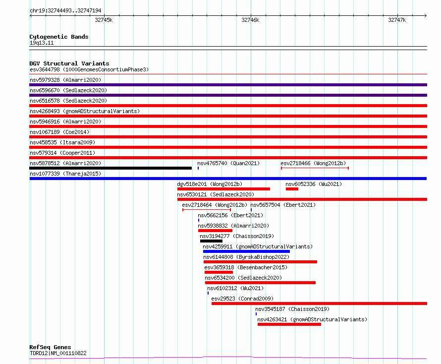 Variant DetailsVariant: nsv1077339| Internal ID | 19317293 | | Landmark | | | Location Information | | | Cytoband | 19q13.11 | | Allele length | | Assembly | Allele length | | hg38 | 2702 | | hg19 | 2702 |