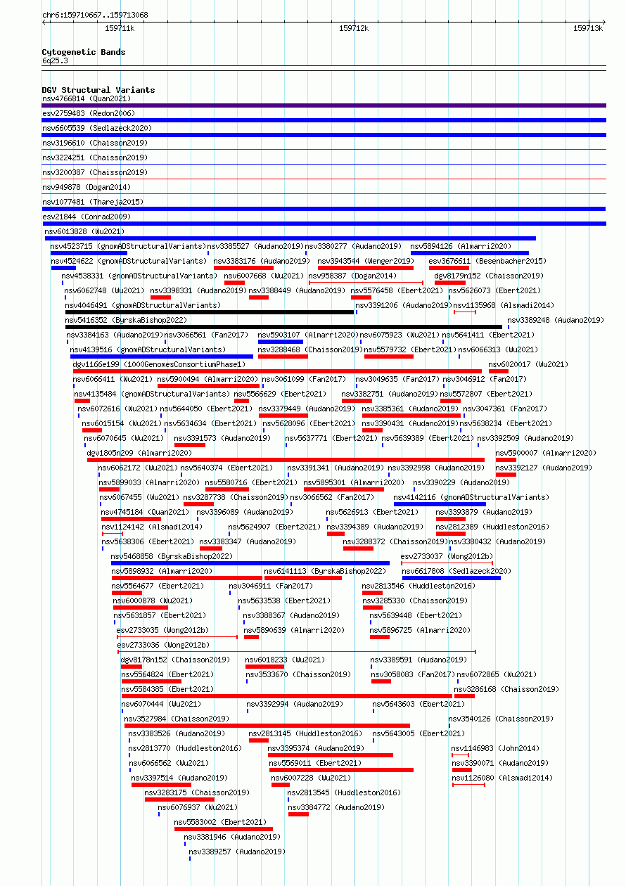 Variant DetailsVariant: nsv1077481| Internal ID | 19325418 | | Landmark | | | Location Information | | | Cytoband | 6q25.3 | | Allele length | | Assembly | Allele length | | hg38 | 2402 | | hg19 | 2402 |