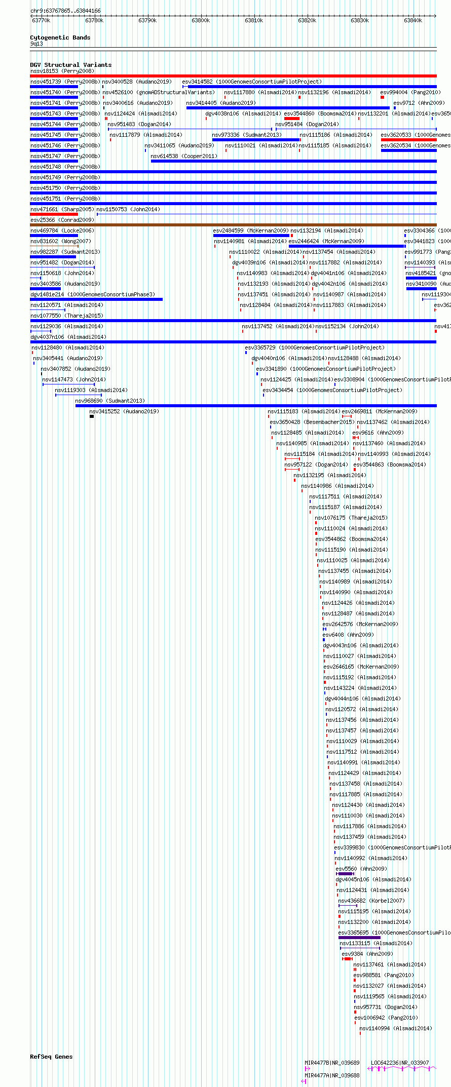 Variant DetailsVariant: nsv1077550| Internal ID | 18970842 | | Landmark | | | Location Information | | | Cytoband | 9q13 | | Allele length | | Assembly | Allele length | | hg38 | 76302 | | hg19 | 76302 |