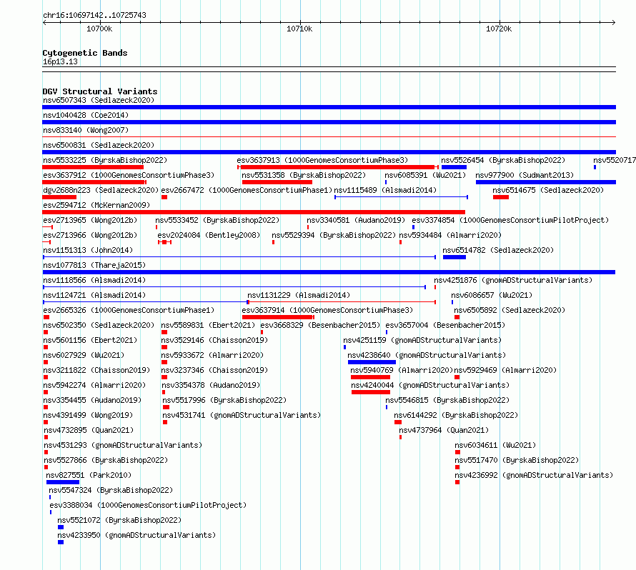 Variant DetailsVariant: nsv1077813| Internal ID | 19320034 | | Landmark | | | Location Information | | | Cytoband | 16p13.13 | | Allele length | | Assembly | Allele length | | hg38 | 28602 | | hg19 | 28602 |
