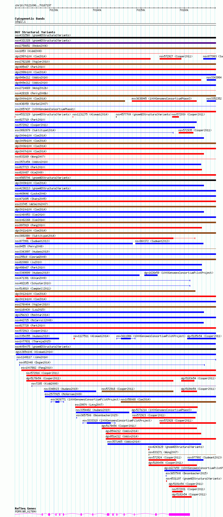 Variant DetailsVariant: nsv1077831Internal ID | 18970795 | Landmark | | Location Information | | Cytoband | 16q22.1 | Allele length | Assembly | Allele length | hg38 | 46102 | hg19 | 46102 |