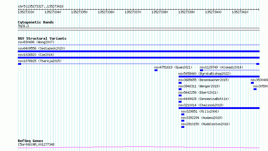 Variant DetailsVariant: nsv1078825| Internal ID | 19322431 | | Landmark | | | Location Information | | | Cytoband | 5q31.1 | | Allele length | | Assembly | Allele length | | hg38 | 90 | | hg19 | 90 |