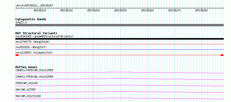 Variant DetailsVariant: nsv1108903| Internal ID | 19248708 | | Landmark | | | Location Information | | | Cytoband | 14q23.3 | | Allele length | | Assembly | Allele length | | hg38 | 77 | | hg19 | 77 |