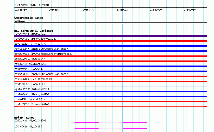 Variant DetailsVariant: nsv1109053| Internal ID | 19264108 | | Landmark | | | Location Information | | | Cytoband | 17p11.2 | | Allele length | | Assembly | Allele length | | hg38 | 57 | | hg19 | 57 |