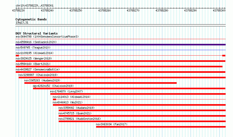 Variant DetailsVariant: nsv1109195| Internal ID | 19261958 | | Landmark | | | Location Information | | | Cytoband | 19q13.31 | | Allele length | | Assembly | Allele length | | hg38 | 73 | | hg19 | 73 |
