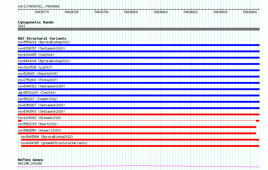 Variant DetailsVariant: nsv1109262| Internal ID | 19269281 | | Landmark | | | Location Information | | | Cytoband | 2p12 | | Allele length | | Assembly | Allele length | | hg38 | 81 | | hg19 | 81 |