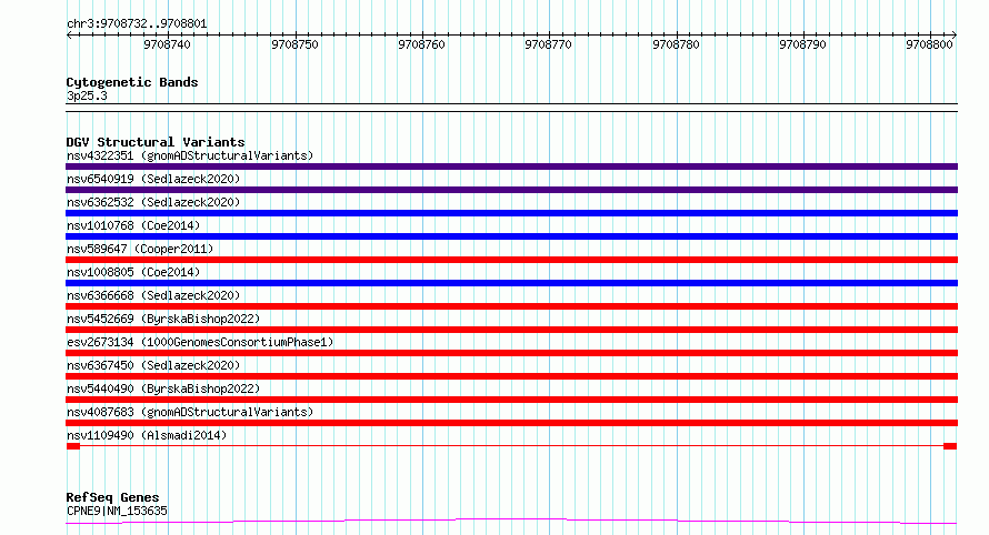 Variant DetailsVariant: nsv1109490| Internal ID | 19256310 | | Landmark | | | Location Information | | | Cytoband | 3p25.3 | | Allele length | | Assembly | Allele length | | hg38 | 70 | | hg19 | 70 |
