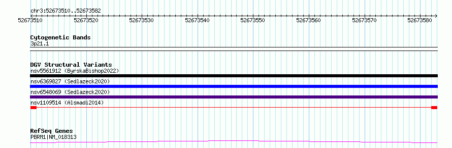 Variant DetailsVariant: nsv1109514| Internal ID | 19260367 | | Landmark | | | Location Information | | | Cytoband | 3p21.1 | | Allele length | | Assembly | Allele length | | hg38 | 73 | | hg19 | 73 |