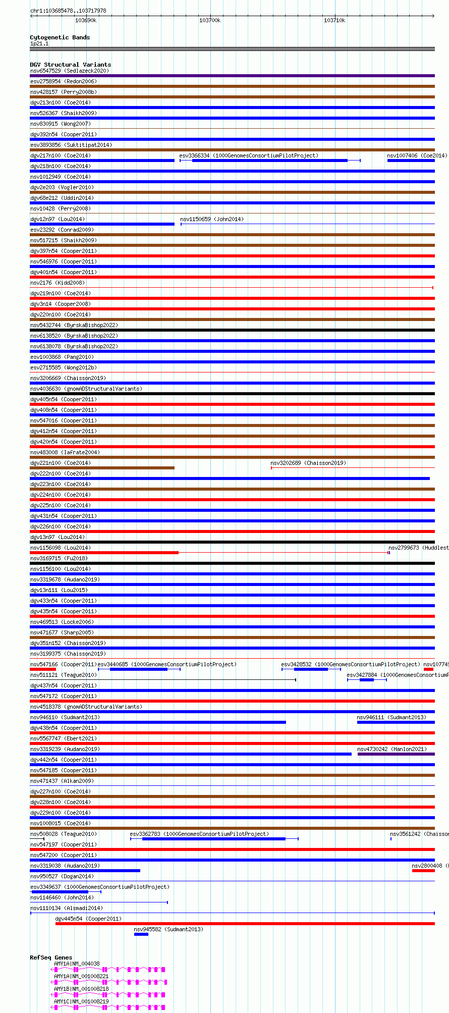 Variant DetailsVariant: nsv1110134| Internal ID | 19282711 | | Landmark | | | Location Information | | | Cytoband | 1p21.1 | | Allele length | | Assembly | Allele length | | hg38 | 32501 | | hg19 | 32501 |