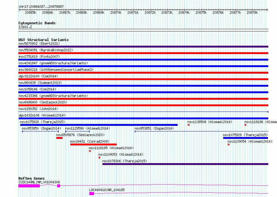 Variant DetailsVariant: nsv1110293| Internal ID | 19283383 | | Landmark | | | Location Information | | | Cytoband | 17p11.2 | | Allele length | | Assembly | Allele length | | hg38 | 14601 | | hg19 | 14601 |