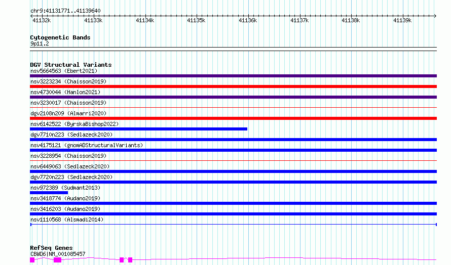 Variant DetailsVariant: nsv1110568| Internal ID | 19285218 | | Landmark | | | Location Information | | | Cytoband | 9q21.11 | | Allele length | | Assembly | Allele length | | hg38 | 7870 | | hg19 | 8301 |