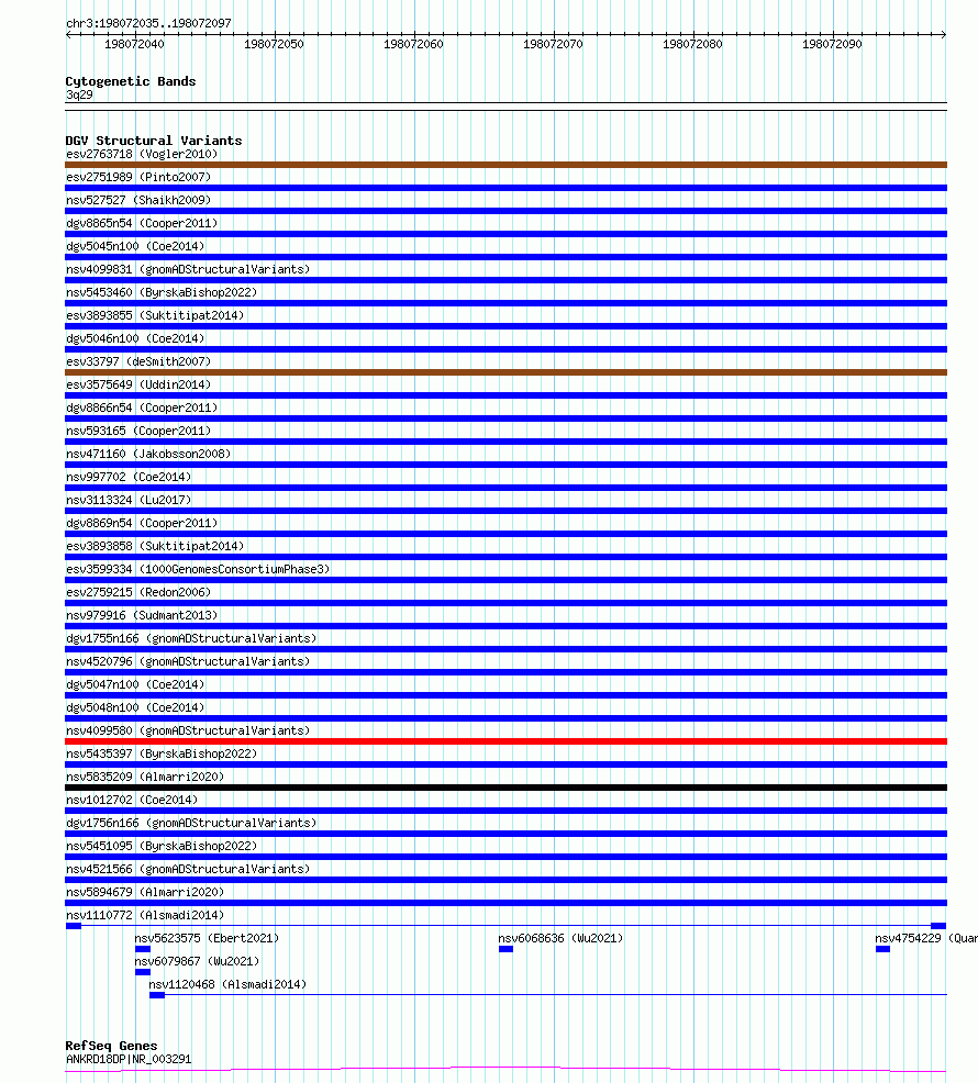 Variant DetailsVariant: nsv1110772| Internal ID | 19252945 | | Landmark | | | Location Information | | | Cytoband | 3q29 | | Allele length | | Assembly | Allele length | | hg38 | 63 | | hg19 | 63 |