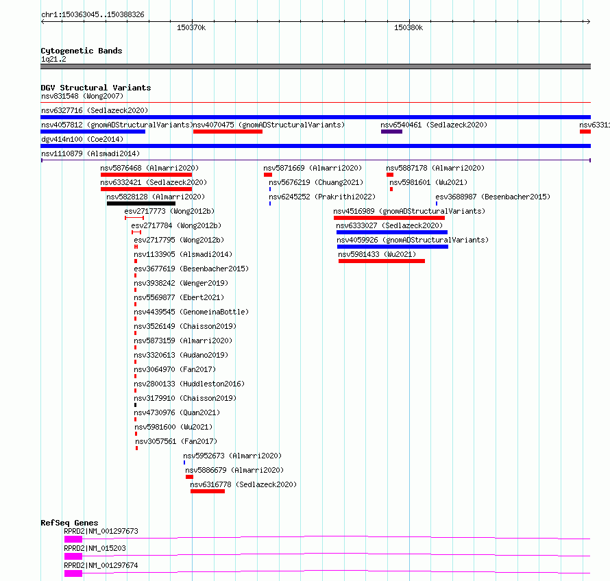Variant DetailsVariant: nsv1110879| Internal ID | 19278369 | | Landmark | | | Location Information | | | Cytoband | 1q21.3 | | Allele length | | Assembly | Allele length | | hg38 | 25282 | | hg19 | 25282 |