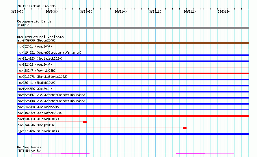 Variant DetailsVariant: nsv1111047| Internal ID | 19265303 | | Landmark | | | Location Information | | | Cytoband | 11p15.4 | | Allele length | | Assembly | Allele length | | hg38 | 67 | | hg19 | 67 |