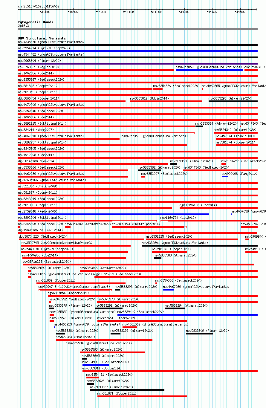 Variant DetailsVariant: nsv1111805| Internal ID | 19280203 | | Landmark | | | Location Information | | | Cytoband | 2p16.3 | | Allele length | | Assembly | Allele length | | hg38 | 85901 | | hg19 | 85901 |