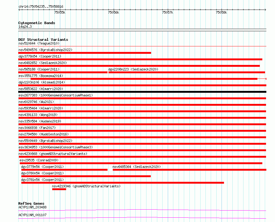 Variant DetailsVariant: nsv1111921| Internal ID | 19259836 | | Landmark | | | Location Information | | | Cytoband | 14q24.3 | | Allele length | | Assembly | Allele length | | hg38 | 4582 | | hg19 | 4582 |