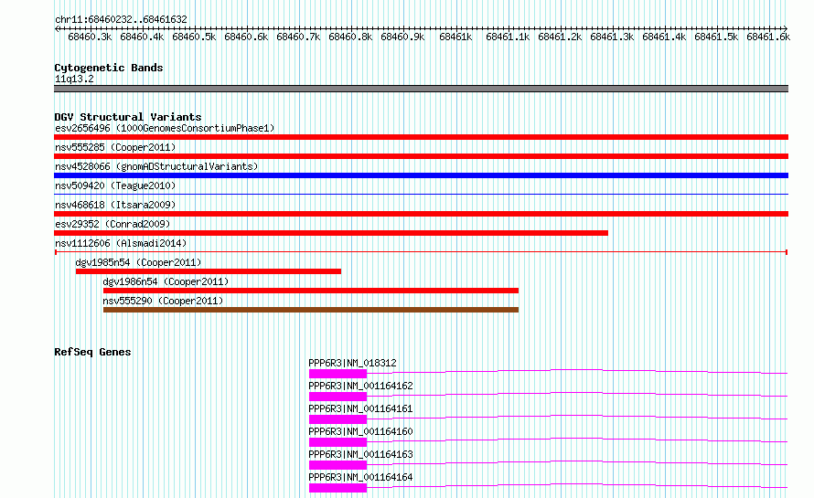 Variant DetailsVariant: nsv1112606| Internal ID | 19268612 | | Landmark | | | Location Information | | | Cytoband | 11q13.2 | | Allele length | | Assembly | Allele length | | hg38 | 1401 | | hg19 | 1401 |