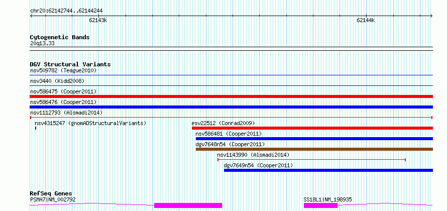 | Variant Type | CNV deletion | Copy Number | | Allele State | | Allele Origin | | Probe Count | | Validation Flag | | Merged Status | M | Merged Variants | | Supporting Variants | nssv3967293 | Samples | KWS2 | Known Genes | PSMA7, SS18L1 | Method | Sequencing | Analysis | HugeSeq | Platform | Illumina HiSeq 2000 | Comments | | Reference | Alsmadi_et_al_2014 | Pubmed ID | 24896259 | Accession Number(s) | nsv1112793