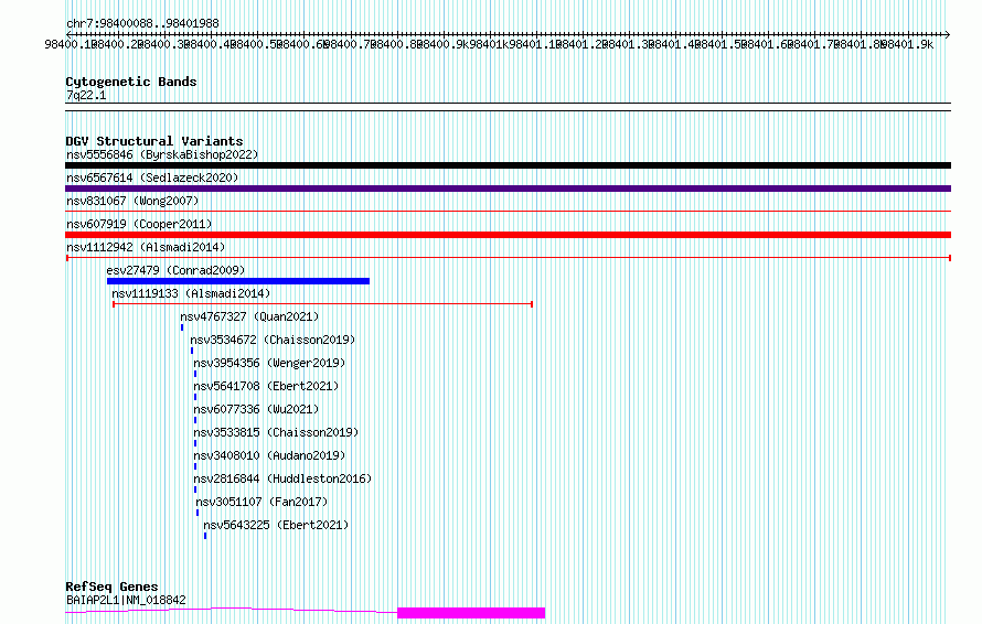 Variant DetailsVariant: nsv1112942| Internal ID | 19286853 | | Landmark | | | Location Information | | | Cytoband | 7q22.1 | | Allele length | | Assembly | Allele length | | hg38 | 1901 | | hg19 | 1901 |