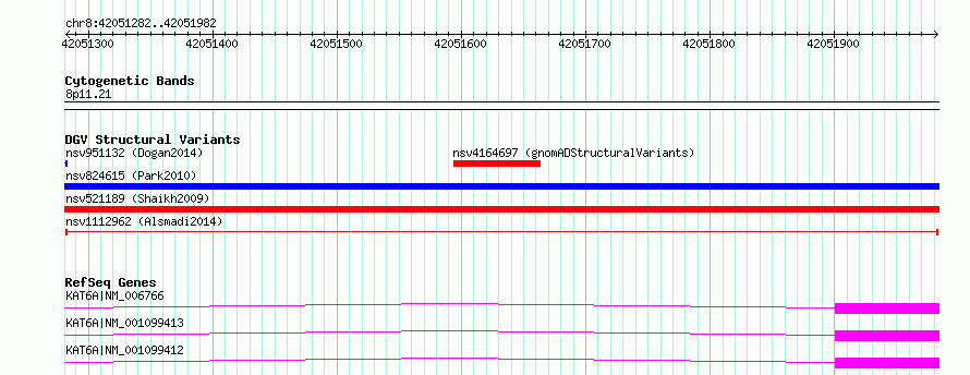 | | Variant Type | CNV deletion | | Copy Number | | | Allele State | | | Allele Origin | | | Probe Count | | | Validation Flag | | | Merged Status | M | | Merged Variants | | | Supporting Variants | nssv3967467 | | Samples | KWS2 | | Known Genes | KAT6A | | Method | Sequencing | | Analysis | HugeSeq | | Platform | Illumina HiSeq 2000 | | Comments | | | Reference | Alsmadi_et_al_2014 | | Pubmed ID | 24896259 | | Accession Number(s) | nsv1112962