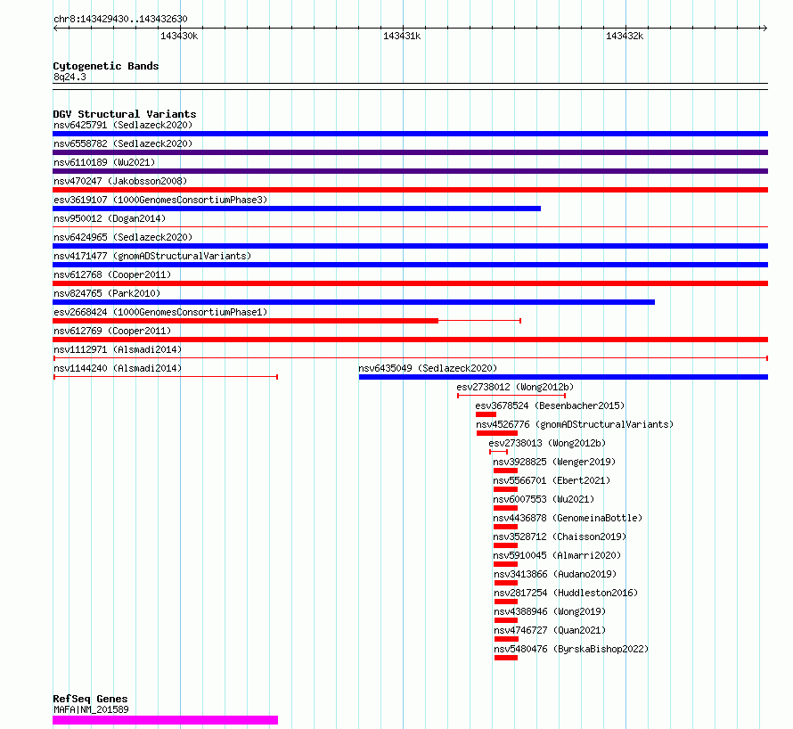Variant DetailsVariant: nsv1112971| Internal ID | 19265809 | | Landmark | | | Location Information | | | Cytoband | 8q24.3 | | Allele length | | Assembly | Allele length | | hg38 | 3201 | | hg19 | 3201 |
